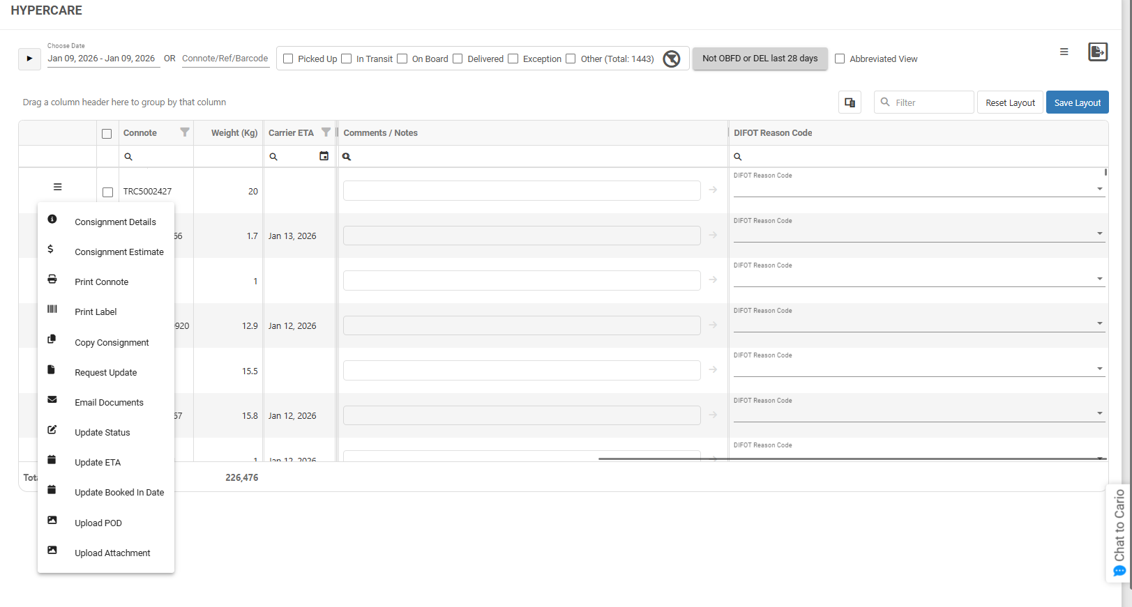 Hypercare brings consignments, shipment events, internal notes, and status updates into a single, centralised dashboard. Advanced filtering by customer, date, consignment, and event status makes it easier to locate issues, prioritise actions, and resolve enquiries efficiently.