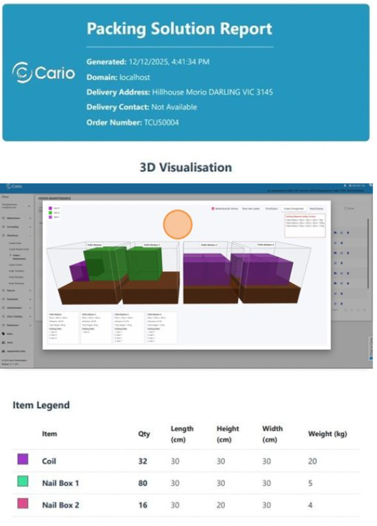 This optional paid feature automatically groups products into optimal transport units using configurable product dimensions, container rules, and tolerances. A 3D visualisation engine allows teams to review packing logic, redistribute items, and maximise container utilisation before shipping.